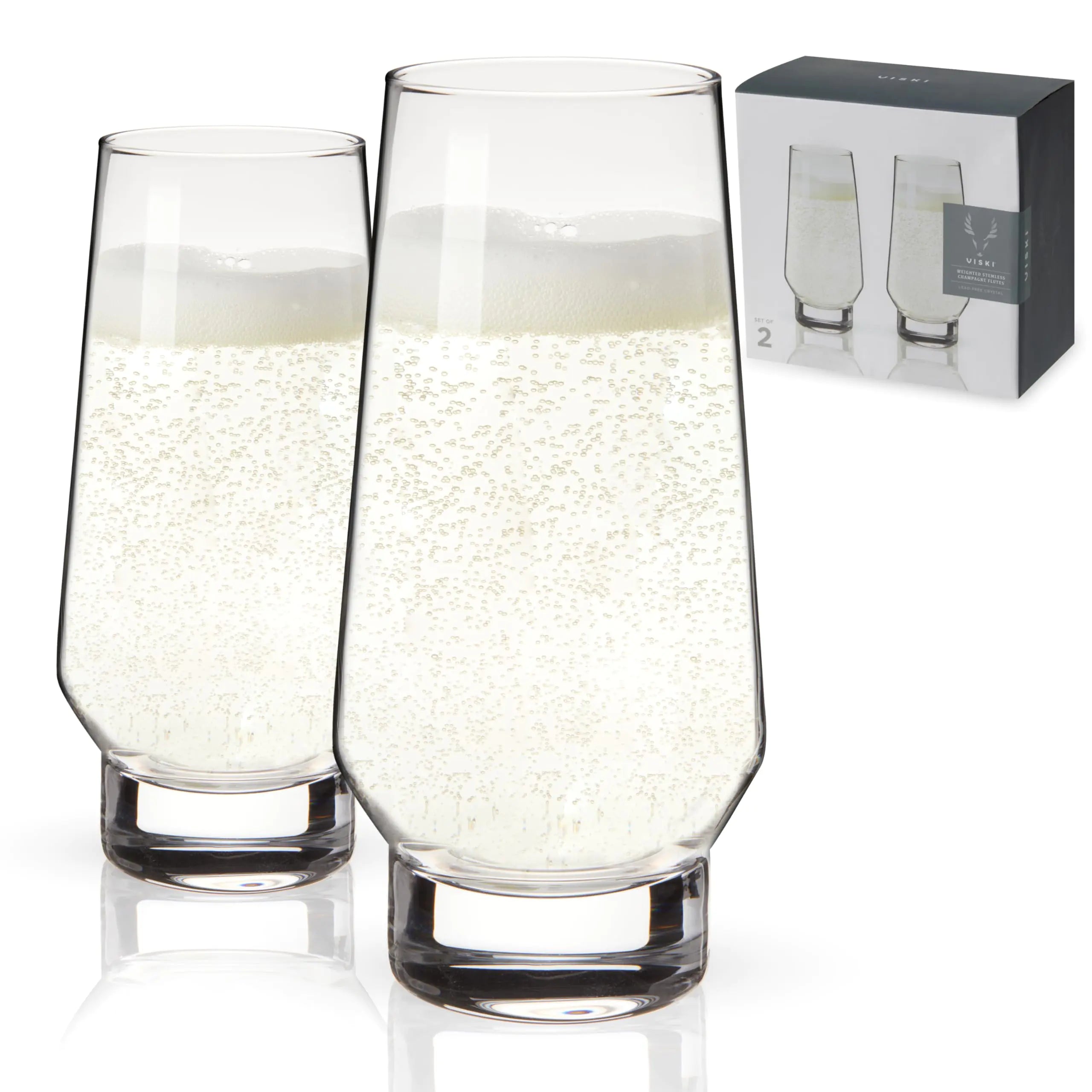 With a tapered rim rounded silhouette and heavy base these crystal champagne flutes have a modern look and substantial stemless base ideal for your favorite prosecco a simple mimosa or elaborate Champagne cocktails.
